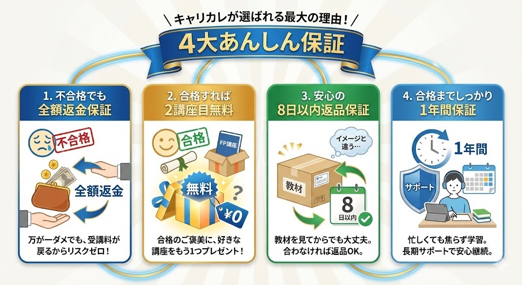 - 不合格なら全額返金という、リスクゼロの金銭的サポート