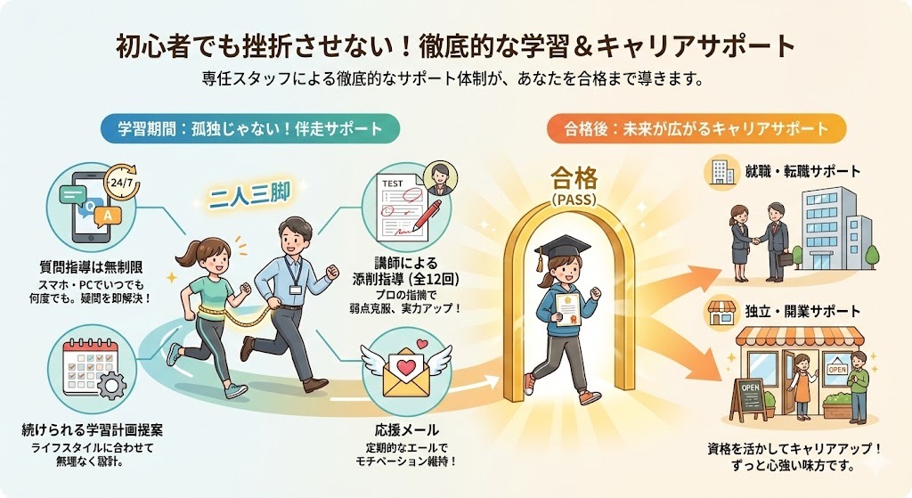 さらに、合格後には就職・転職サポートや独立・開業サポートも用意されています。資格を活かしてキャリアアップしたい方にも心強い味方です。