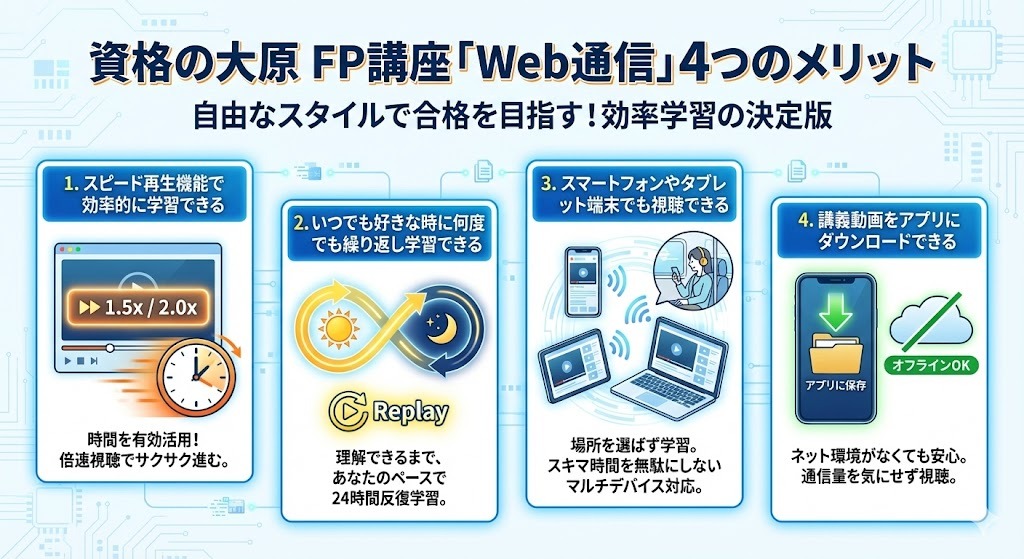 ●スピード再生機能で効率的に学習できる ●いつでも好きな時に何度でも繰り返し学習できる ●スマートフォンやタブレット端末でも視聴できる ●講義動画をアプリにダウンロードできる