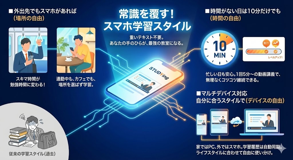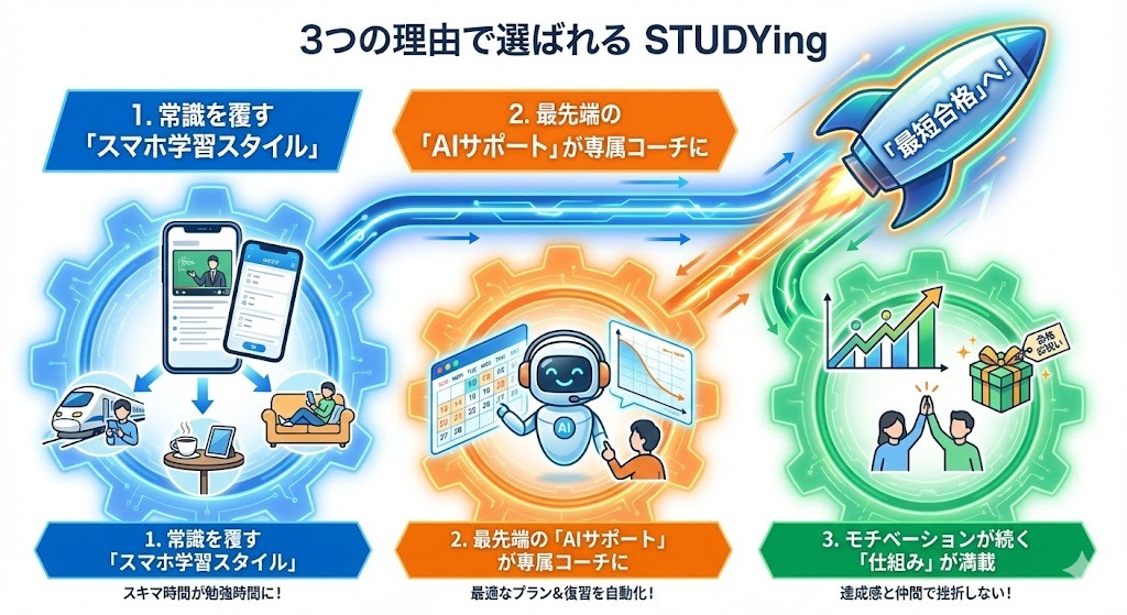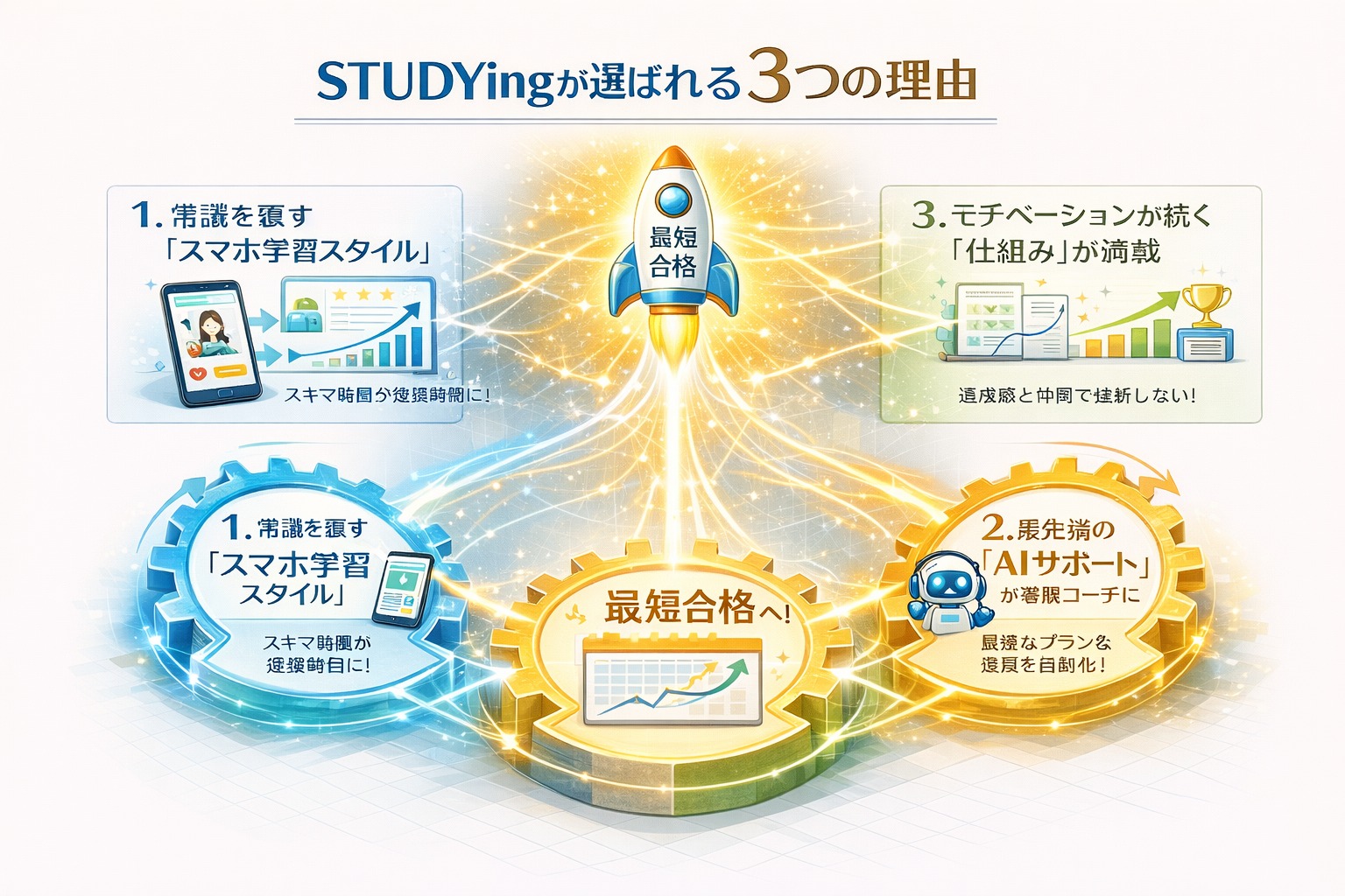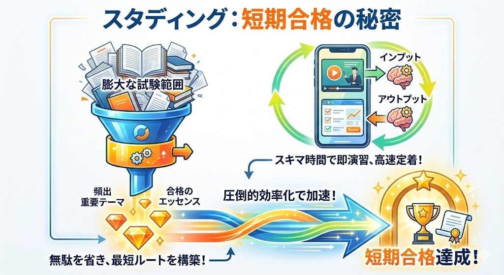 スタディングが多くの受験生から支持される理由は、一言で言えば、忙しい現代人のライフスタイルに最適化された学習システムにあります。