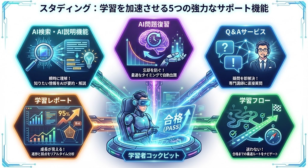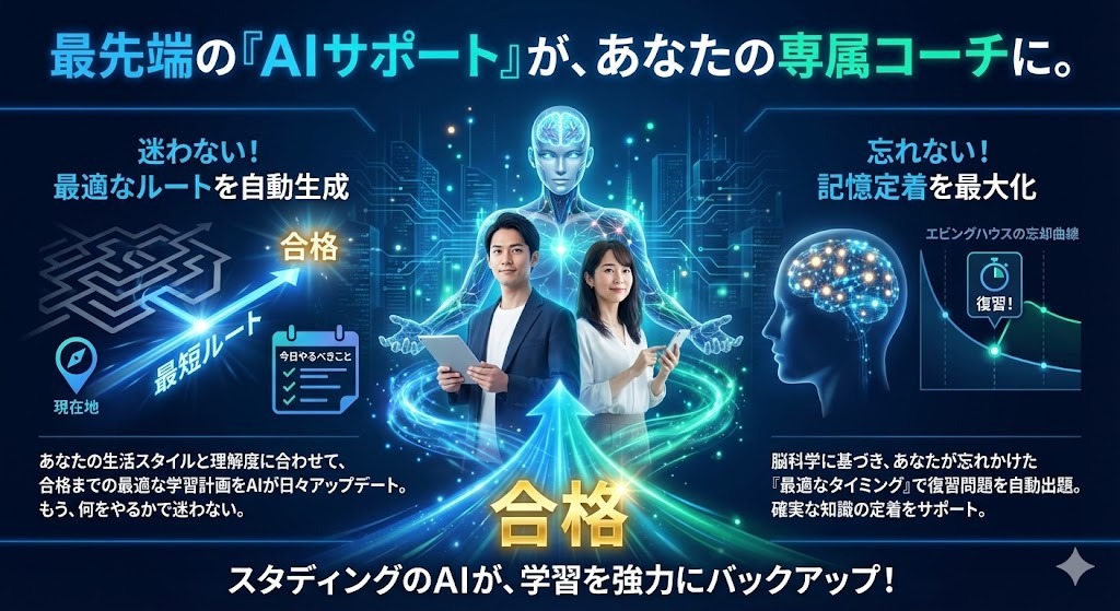 しかし、スタディングなら心配無用です。最先端のAIが、あなた専属のコーチとなって、学習を強力にサポートしてくれるからです。
